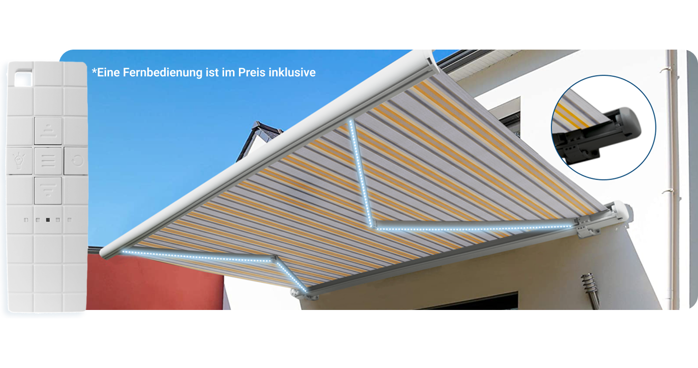 Das Öffnen und Schließen von der Markise funktioniert stufenlos und nahezu geräuschlos mit dem unsichtbaren und TÜV geprüften Funkmotor. Das alles schaffen Sie mit nur einer Handbewegung per Knopfdruck, dank der mitgelieferten Fernbedienung. Im Gegensatz zur Konkurrenz ist unser Motor mit einen Schukostecker (EU) ausgestattet, für einen sofortigen Anschluss an Ihrer Fassade.