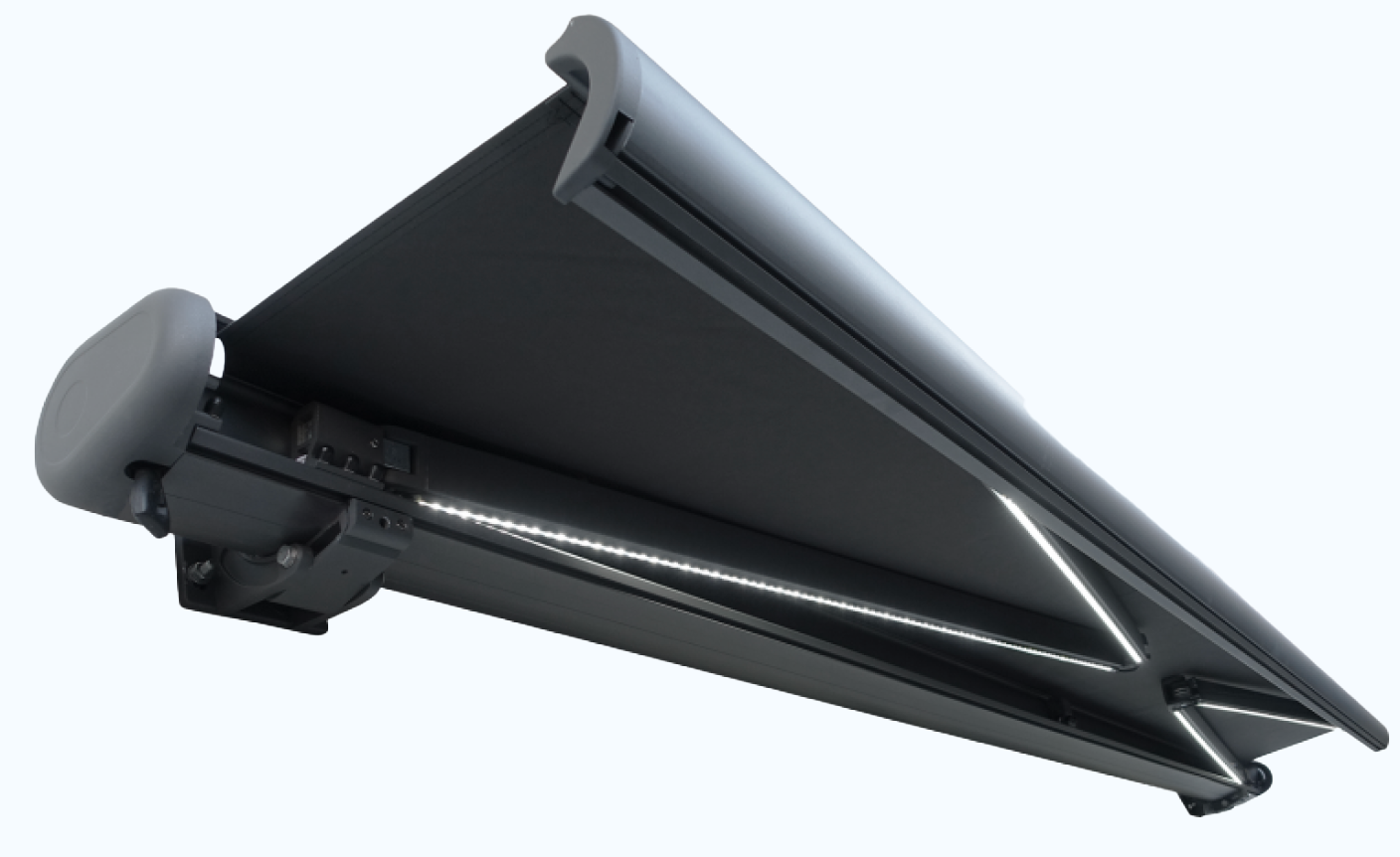 Noch längerer Terrassengenuss – für ein angenehmes Ambiente-Licht am Abend sorgt die integrierte LED-Beleuchtung unter den Gelenkarmen.